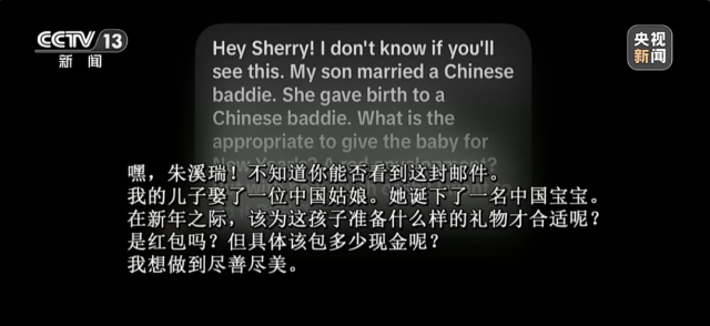 春节前,一位外国的阿姨特意给朱溪瑞发信息,说自己的儿媳妇是中国人,马上要生宝宝了,她很想给儿媳发个新年红包表达祝福,但因为不了解中国文化,不知道放多少钱合适,直接问儿媳又怕尴尬,于是特意来向朱溪瑞请教。