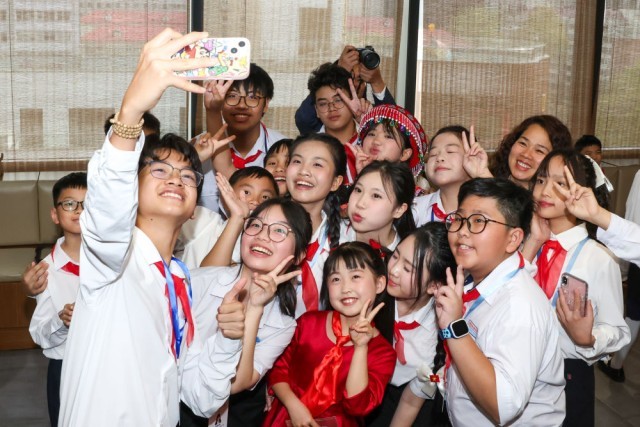 ↑ 4月14日,在中国宋庆龄青少年科技文化交流中心,越南青年“红色研学之旅”之“不忘初心”研学营少先队分团成员和中国宋庆龄青少年科技文化交流中心学员合影留念。