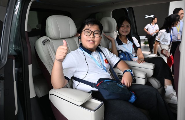 ↑ 4月13日,在广州小鹏科技园,越南青年“红色研学之旅”之“不忘初心”研学营成员体验小鹏新能源汽车。