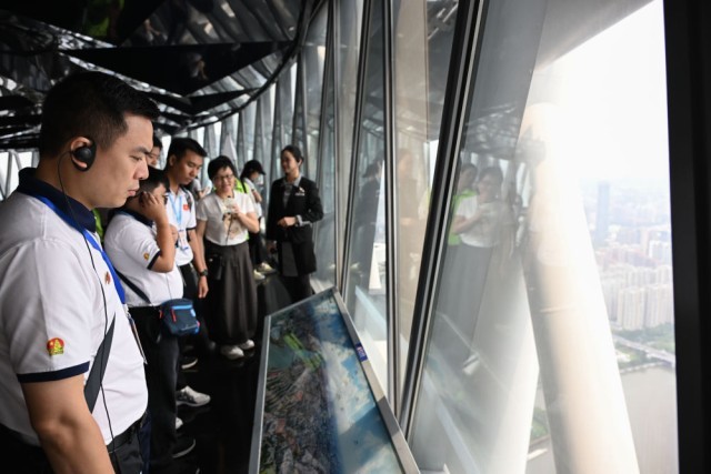 ↑ 4月13日,在广州塔观光大厅,越南青年“红色研学之旅”之“不忘初心”研学营成员了解广州城市建设情况。