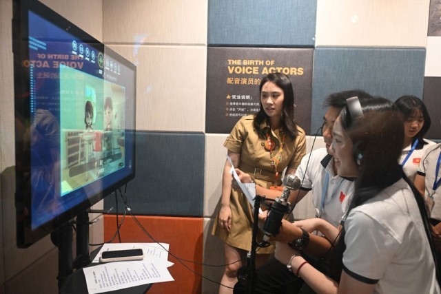 ↑ 4月13日,在广州咏声动漫股份有限公司展馆,越南青年“红色研学之旅”之“不忘初心”研学营成员体验动漫配音。