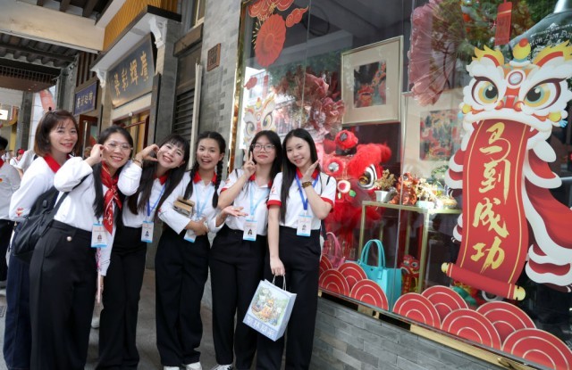 ↑ 4月12日,越南青年“红色研学之旅”之“不忘初心”研学营成员在广州永庆坊了解活字印刷相关知识。