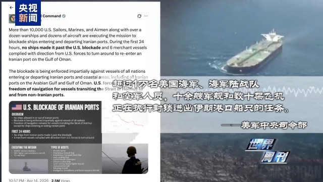 美军中央司令部称,超过1万名美国海军、海军陆战队和空军人员,十余艘军舰和数十架飞机正在执行封锁进出伊朗港口船只的任务。