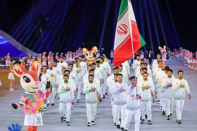 4月22日晚上,在本届亚沙会开幕式运动员入场仪式上,伊朗代表团全员以右手放在胸前的姿势表达他们对在战争中遇难同胞的哀悼。