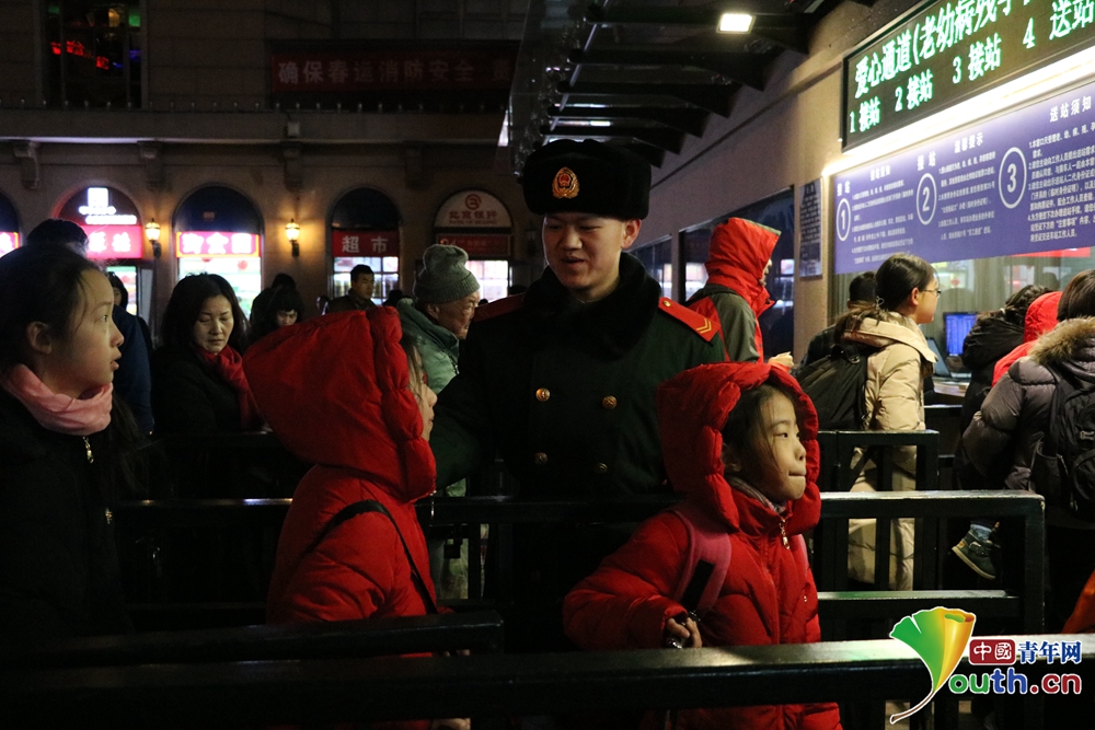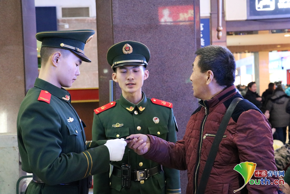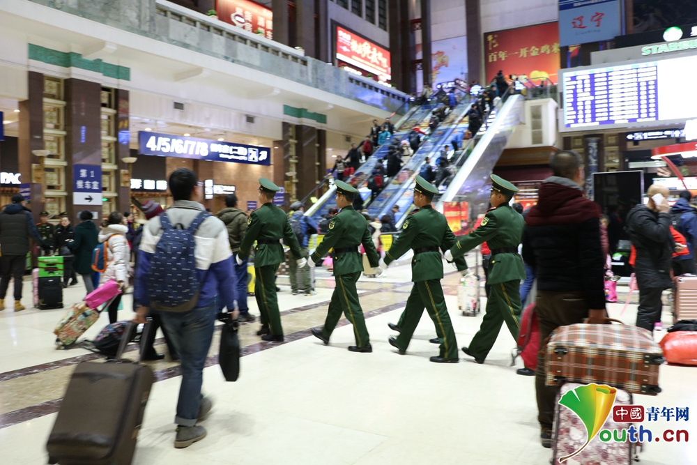 中国青年网北京1月23日电(记者 刘尚君 通讯员 毛帅 姜国锋)春节的脚步临近,北京火车站迎来了春运返乡高峰。面对着巨大的客流量,驻守在北京火车站的武警北京总队一支队增加了执勤兵力,战士们每日执勤长达十八个小时,为每一名旅客坚守回家的路。