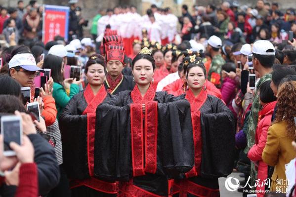 人民网秭归3月4日电 3月3日,一场主题为“楚缘中国风”集体婚礼在湖北屈乡秭归凤凰山南门外广场上演。16对参加集体婚礼中,有8对已领取婚姻登记证的社会新人,6对最美家庭夫妇和2对金婚夫妇参加了此次集体婚礼。