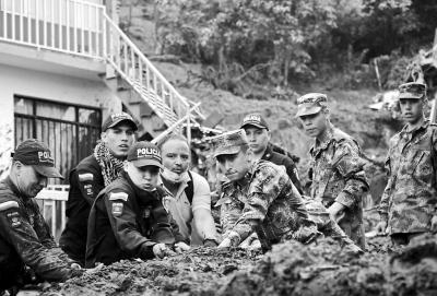 哥伦比亚中部卡尔达斯省马尼萨莱斯市 警察和士兵在泥石流灾害发生地清理现场