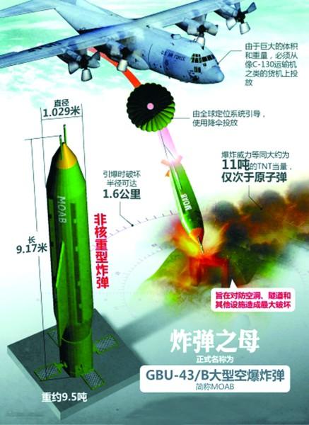 至于说近日美军在阿富汗投掷的新型空爆弹GBU-43/B,其正式名称是“大型军用空爆弹”,缩写为MOAB。因其威力巨大,故而美军故意将MOAB解释为“炸弹之母”。其中内部装药就有8.2吨。它的冲击波杀伤半径大约137米,而对氧气的燃烧半径则超过五百米。