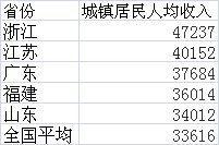 统计数据显示,在东部5省中,浙江的富裕度最高,是全国唯一一个省内所有地级市的城镇居民人均可支配收入都超过全国平均水平的省份。