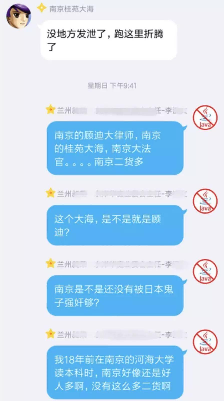 2018年3月11日,有网友爆料,兰州一网民在某业主事务讨论qq群、微信群发表了“南京是不是还没有被日本鬼子强奸够”等极端言论,引发公众强烈谴责。兰州警方接到群众报案后高度重视,市局网安支队、城关分局立即开展调查工作,并于14日在兰州市榆中县夏官营将违法行为人李某抓获。