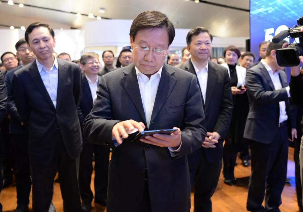 △中宣部常务副部长王晓晖(中)通过华为5G折叠手机进行4K节目投屏操作