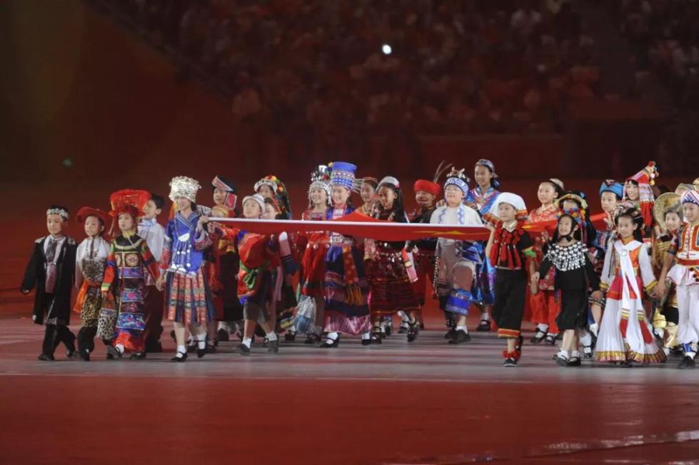 在2008年北京奥运会开幕式上,各民族儿童在《歌唱祖国》的旋律中簇拥着鲜艳的中国国旗入场。(资料图片)