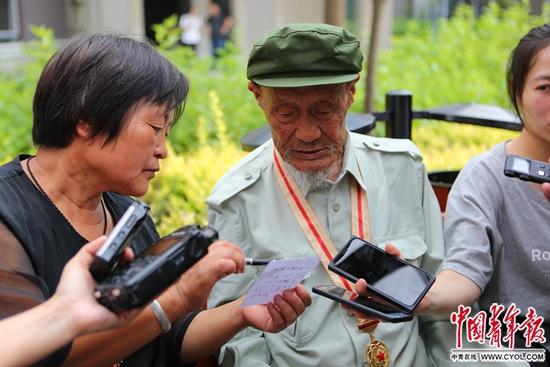8月6日,陕西省延安市八一敬老院,98岁的老红军康文华(中)接受记者采访。他1935年参加刘志丹所属的游击队,1936年在红二十八军当战士,参加过平型关战役、百团大战等。中国青年报·中国青年网见习记者 曲俊燕/摄