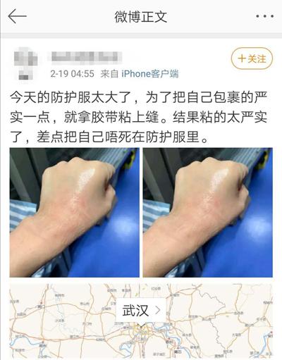 对很多女性医护人员而言,防护服往往过于肥大,有的裆部甚至垂到膝盖,穿起来邋遢,阻碍行动。一些防护服没有收腰的设计,武汉肺科医院门诊的支助中心护士为了行动方便,常用绳子当腰带。防护服的每一处缝隙都需要贴上密封胶带,隔绝与外界的接触。尺码过大增加了人体与防护服间的空隙,许多女性医护人员在穿戴时,要使用更多胶带来保证防护服的密封性。长时间工作之后,手腕被胶条勒出痕迹,透气性不好还会闷出疹子。