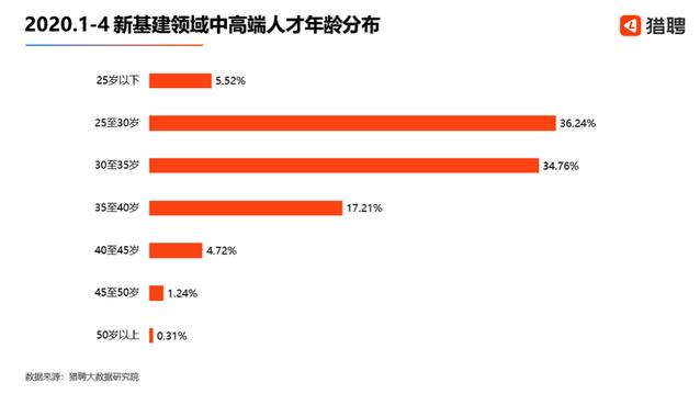 新基建总体领域的中高端人才分布最多的年龄段是25-30岁,占比为36.24%。30岁以下的中高端人才占比为41.76%,这部分人对应的正是90后群体,这表明年轻人在这个领域占据主要地位。