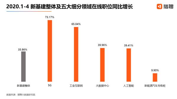 疫情带来的经济压力下,新基建总体上的在线职位呈现出较快的逆势增长态势。2020年1-4月,新基建总体领域在线职位比2019年同期增长了35.86%。从细分领域来看,5G、工业互联网、大数据中心、人工智能的增长均超过39%,高出了新基建整体在线职位增长水平。相比之下,新能源汽车充电桩领域在线职位增幅相对较低,为9.90%。