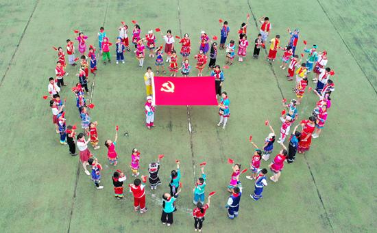 6月23日,浙江省台州市仙居县第五小学,学生们列队拼出“心”形围绕在党旗周围。当日,浙江省台州市仙居县纪委第四纪检监察室和城关派出所与第五小学共同举行“童心向党迎七一”主题教育活动。人民视觉供图
