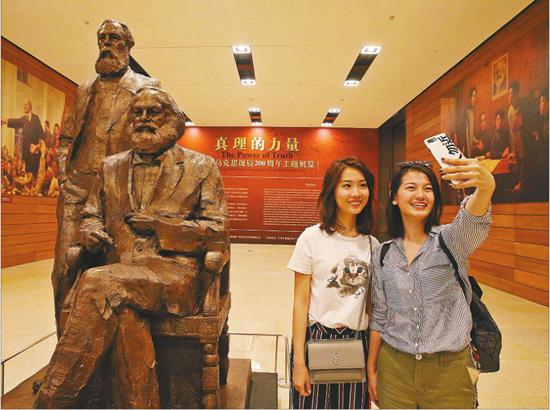 2018年5月5日,北京,两位女孩在北京举行的“真理的力量——纪念马克思诞辰200周年主题展览”上马克思恩格斯塑像前用手机自拍。人民视觉供图