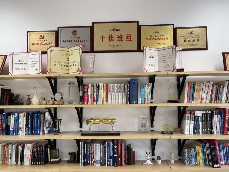1月29日,中青报·中青网记者来到中国航天科工二院二十五所,探访和感受航天青年加班加点为空间工程加油干的热度。一进办公楼,二十五所团委书记刘腾达指了指门口的“黑科技”介绍道,“这个也是我们所研制的,支持20人以上同时测温,精度可达±0.1℃”。通过体温测量,记者来到二十五所的“职工小家”,一个简易的书架上摆满各种奖杯奖状和荣誉证书,足足占据一整面墙,“载人航天工程重大贡献先进集体”“中国五四青年奖章(集体)”“中国航天质量奖”……