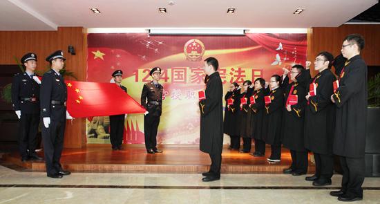 2014年12月4日,我国首个“国家宪法日”到来之际,浙江温州开展法官授职宣誓仪式,瓯海法院的法官右手握拳,高举过肩,向国旗、宪法庄严宣誓。林志强/摄