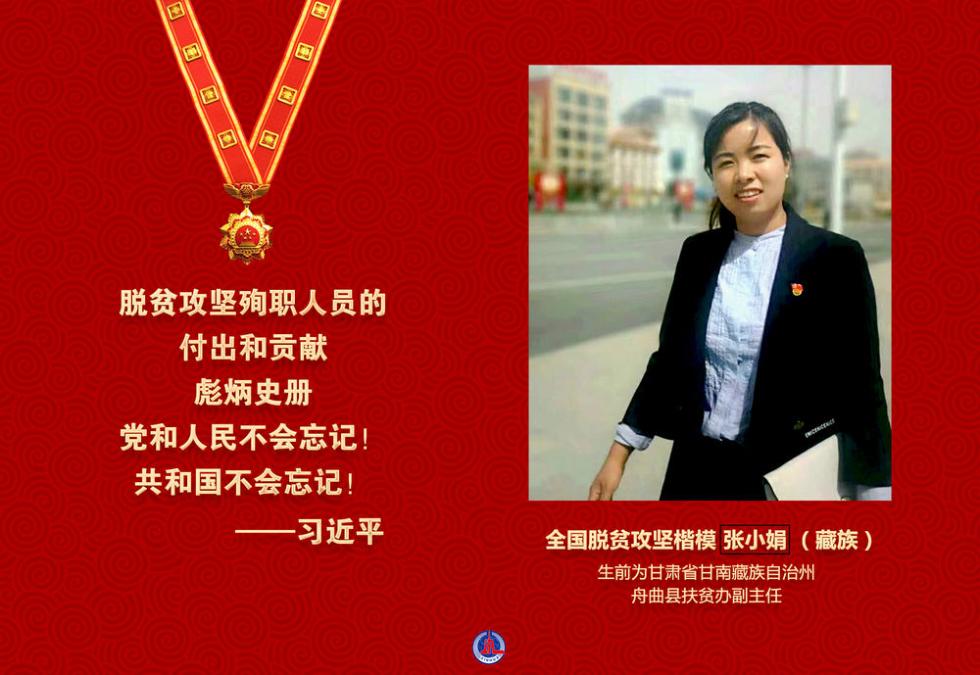 张小娟同志是在习近平新时代中国特色社会主义思想指引下成长起来的优秀共产党员,是在脱贫攻坚一线不懈奋斗的优秀青年干部。2019年10月7日,在舟曲县贫困乡镇脱贫攻坚验收结束返回县城途中因交通事故不幸殉职,年仅34岁。