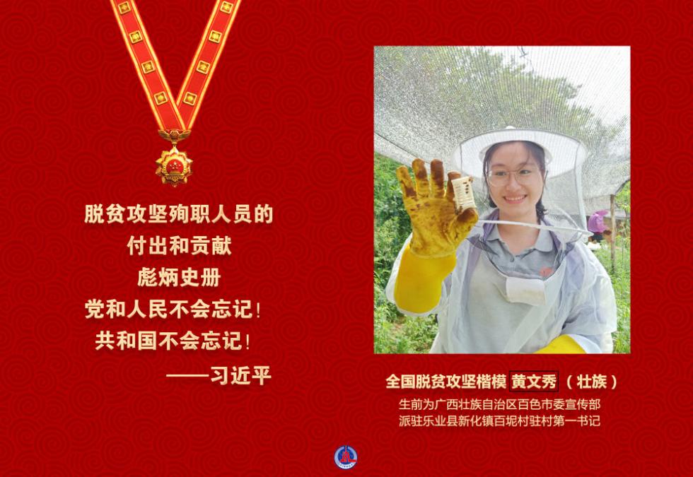 黄文秀同志把青春和热血都献给了脱贫攻坚事业,以实际行动诠释了共产党人的初心和使命,用短暂而精彩的人生谱写了一曲新时代共产党员的奉献之歌。2019年6月17日牺牲在脱贫攻坚一线,年仅30岁。