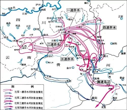 面对蒋介石布下的天罗地网,毛泽东同志将计就计,让红军佯装在遵义徘徊,引敌深入。敌军蜂拥而至时,红军在遵义茅台镇及附近地区三渡赤水,白天“大张旗鼓”渡河,将敌人向西引入川南。敌军果然再次将兵力部署于川南。此时,我军以一个团伪装成主力部队继续西进诱敌,但真正的主力部队却隐蔽在赤水河畔,于3月21日、22日顺利从二郎滩、太平渡等渡口四渡赤水。
