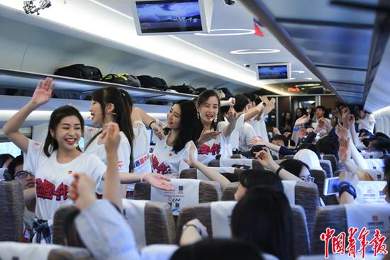 2018年5月4日,“开往2049——00后五四成人礼”公益活动,北京南站开往上海虹桥的复兴号G7次列车上,现场进行“快闪”演唱。音乐声响起,青年学生依次站起。快闪歌曲有:《最初的梦想》《稻香》《我爱你中国》《强国一代有我在》……大家纷纷合着音乐跟唱这些耳熟能详的爱国歌曲。 中青报·中青网记者 赵迪/摄