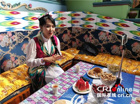 国际在线消息(记者谢诗佳):上午9点50分,沙拉麦提古丽准时打开抖音账号开始直播展示“自己的家”:在一个维吾尔族传统院落内,条桌上摆放着各色干果;木制扶手上雕刻着精美的花纹;随处可见的艾德莱斯绸,明快的色彩点亮了整个院落;身着传统民族服饰的姑娘们忙前忙后热情接待到访的客人……网友们纷纷给她留言: 太漂亮了!我已经迫不及待想去喀什古城拜访你的家了!