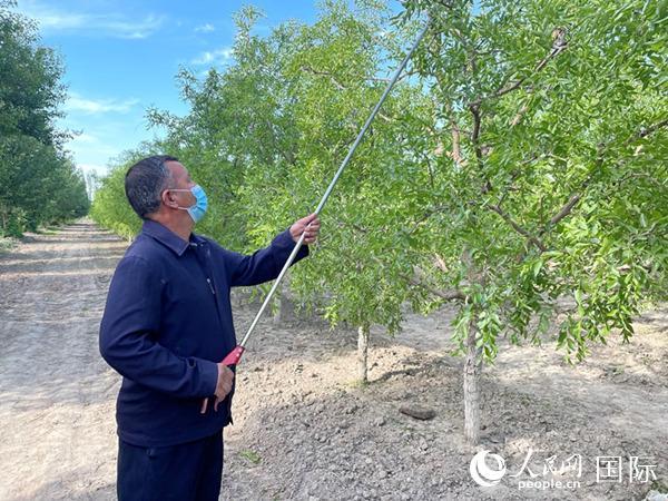 央塔克乡枣农修剪枣树枝叶。人民网 张荣摄