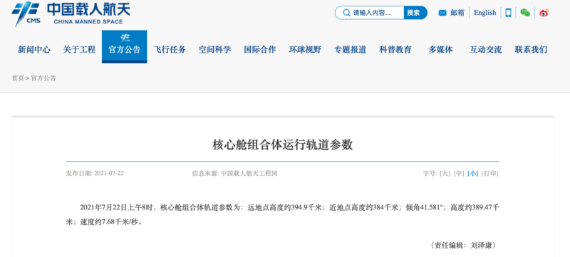 中国青年报客户端北京7月22日电(中青报·中青网记者 邱晨辉)今天,中国载人航天工程办公室发布空间站核心舱组合体运行轨道参数,这是官方首次公开这一参数。