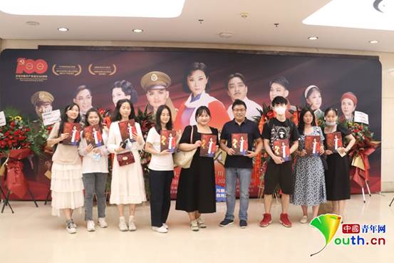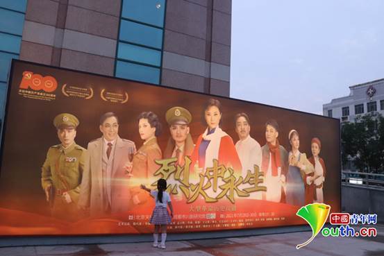 观众们在川剧《烈火中永生》宣传海报前拍照。 中国青年网记者 韩玉 摄