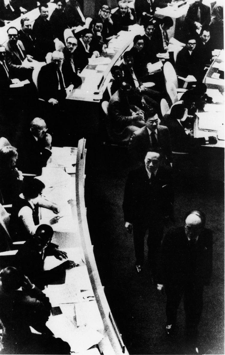 大会主席马利克将“重要问题案”进行唱名表决,结果是59票反对、55票赞成、15票弃权被否决。外电报道说,“当电子统计牌上出现表决结果,表明美国的建议被击败时,大厅里立刻沸腾起来”,“挤得满满的会议厅中发出了长时间的掌声”。而美、日代表则“沉默不语”,“表情坚若石头”。 “联合国代表们今晚击败了美国为保住台湾在联合国的席位而做出的努力,从而为北京进入联合国铺平了道路。他们在走廊里高声欢笑、歌唱、欢呼、拍桌子。” (路透社,合众社)