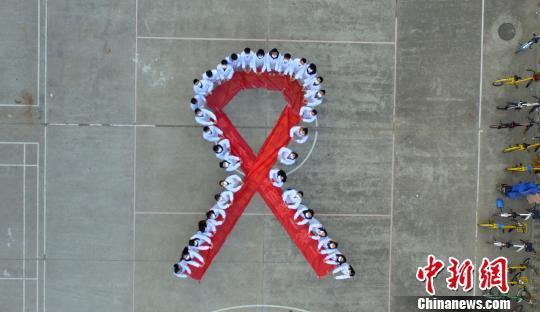 资料图:大学生们携手“抗艾”,拼大型“红丝带”图案。 孟德龙 摄