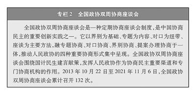 中国人民政治协商会议是实行中国共产党领导的多党合作和政治协商制度的重要机构。人民政协作为专门协商机构,在协商中促进广泛团结、推进多党合作、实践人民民主,既秉承历史传统,又反映时代特征,充分体现了中国社会主义民主有事多商量、遇事多商量、做事多商量的特点和优势,是国家治理体系的重要组成部分和具有中国特色的制度安排。在人民政协制度平台上,各党派团体、各族各界人士发挥在界别群众中的代表作用,通过全体会议、常委会会议、主席会议、专门委员会会议、专题协商会议、协商座谈会议等,开展提案、委员视察考察、专题调研、反映社情民意等经常性工作,对国家大政方针、经济社会各领域重要问题,在决策之前和决策实施之中进行广泛协商、平等协商、有序协商、真诚协商,提出意见建议。中国共产党采纳和集中他们的意见建议,各党派团体、各族各界人士接受党的主张并在各界别群众中宣传解释党的方针政策,增信释疑,最广泛地反映民意,最充分地集思广益,最大限度地凝聚共识,巩固团结奋斗的共同思想基础。全国政协全体会议与全国人大会议每年同期召开,政协委员不仅要讨论政协的问题,还要列席全国人大会议,参加对有关法律修改、“一府两院”工作报告等的讨论,这样的制度安排真正实现了让人人起来负责、人人监督政府工作,形成了具有中国特色的“两会”式民主。
