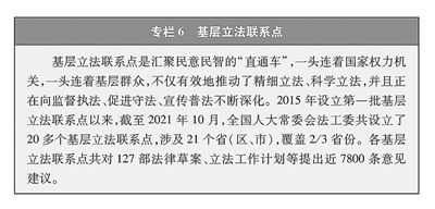 人大“开门立法”。各级人民代表大会及其常务委员会,坚持为民立法、民主立法,保障人民通过各种途径参与立法活动,努力让每一项立法反映人民意愿、得到人民拥护。法律立项,通过召开座谈会、听证会、论证会等方式,广泛听取意见,让人民的意志在立法的最初阶段就得到体现;法律草案起草,广泛听取公众意见和专业人士建议,探索委托第三方起草法律法规草案,让人民的诉求得到充分体现;法律草案公布,通过网络和新闻媒体,向社会各界广泛征求意见。基层群众通过基层立法联系点,直接参与法律草案的起草、立法调研、修改论证、立法后评估等多个环节。