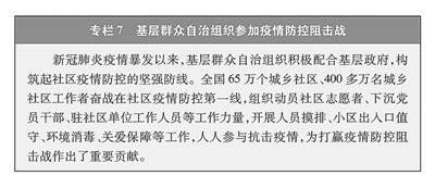 村(居)民自治。村(居)民在基层党组织的领导下,成立村(居)民委员会,依法直接行使民主权利,依法管理基层公共事务和公益事业。实行民主选举,由村(居)民选举村(居)民委员会组成人员;实行民主协商,由村(居)民采取多种形式开展协商议事;实行民主决策,由村(居)民通过村(居)民会议或村(居)民代表会议对社区公共事务和公益事业等作出决定;实行民主管理,由村(居)民讨论决定村(居)民自治章程、村规民约、居民公约等,并进行自我管理;实行民主监督,由村(居)民推选产生村(居)务监督委员会,监督村(社区)事务和村(居)务公开制度落实。截至2020年底,50.3万个行政村全部建立了村民委员会,11.2万个社区全部建立了居民委员会。