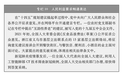 人民参与民主的意愿不断增强,参与的广度和深度不断拓展。人民既参与国家和社会事务管理,又参与经济和文化事业管理;既参与国家发展顶层设计的意见建议征询,又参与地方公共事务治理;既参与民主选举、民主协商,又参与民主决策、民主管理、民主监督;既通过人大、政协等渠道表达意愿,又通过社会组织、网络等平台表达诉求。从“数豆豆”②到电子投票,从群众跑腿到“数据跑路”,民主参与的形式不断创新、渠道不断拓展。党和国家要做什么、如何做、做得怎么样,人民参与贯穿始终。