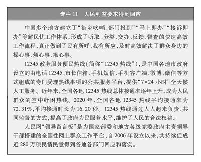 人民利益要求既能畅通表达,也能有效实现。民主,起始于人民意愿充分表达,落实于人民意愿有效实现。人民意愿只能表达、不能实现,不是真正意义的民主。在中国,人民的期盼、希望和诉求,从国家大政方针,到社会治理,再到百姓衣食住行,有地方说、说了有人听、听了有反馈。人民的意愿和呼声,经过民主决策程序成为党和国家的方针政策,并通过中央、省、市、县、乡镇各个层级的紧密配合、层层落实,通过各个职能部门之间主管、主办、协管、协办的分工合作、协调配合,通过决策、执行、检查、监督、问责等各个环节的相互配合、有机衔接,转化为实现人民意愿的具体实践。对于涉及自身利益的实际问题,人们通过信访平台、领导信箱、政务热线、网络“留言板”等提出意见和诉求,能够得到及时反馈和回应。