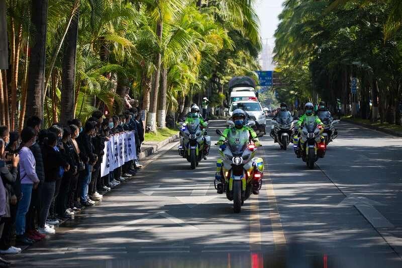 仪式后,在警车护卫下,载着蔡晓东遗体的灵车缓缓驶往殡仪馆,前来送别的上万名战友、群众紧随其后,自发在道路两侧筑起一道千米护送人墙,久久不愿离去……