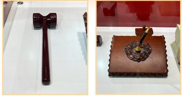 图为见证中国加入世界贸易组织的主席槌(仿制件)(左)和签字笔(仿制件)(右)。