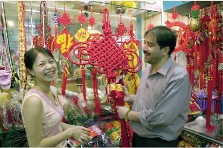 图为外国采购商在义务中国小商品城与女摊主讨价还价。