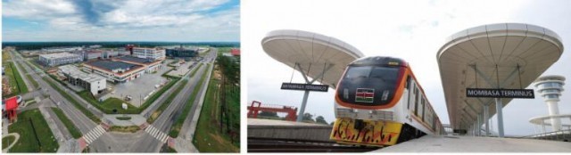 左图为中国-白俄罗斯工业园;右图为2017年5月,中国企业建设并参与运营的肯尼亚蒙内铁路正式竣工通车。