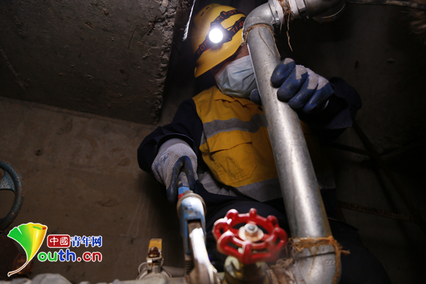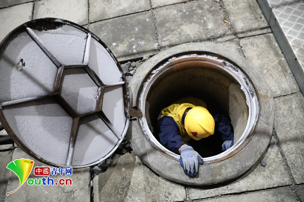 管道工李林忠和陈权今年57岁,但下井作业一点也不含糊,戴好安全帽后,两人开始了下井作业。“方井无异常。”陈权首先检查完了方井后报告给工长。