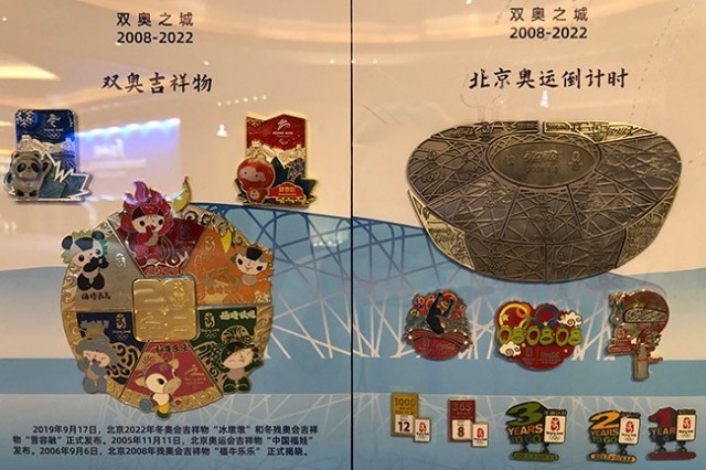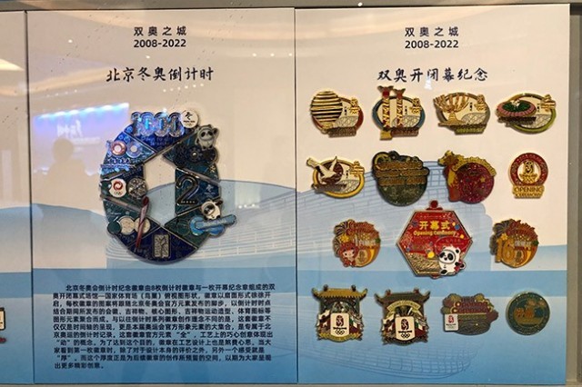 2022北京新闻中心“奥运徽章时空交换站”展示“最美北京”“双奥之城”“运动之美”等八个系列的徽章。 人民网记者 鲍聪颖摄