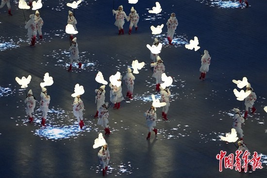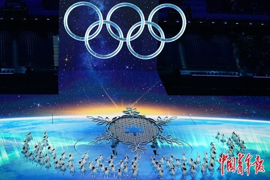 2月4日晚,第二十四届冬季奥林匹克运动会开幕式在北京国家体育场举行。各国运动员入场后,引导员手中的雪花在舞台中央汇成一朵巨大的雪花。 中青报·中青网记者 李隽辉/摄