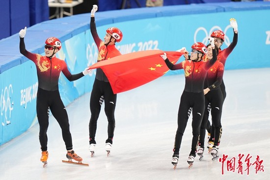当日,在首都体育馆举行的北京2022年冬奥会短道速滑项目混合团体接力决赛中,中国队夺得冠军。这也是中国代表团在北京2022年冬奥会上夺得的首枚金牌。 中青报·中青网记者 李隽辉/摄