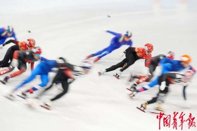 在刚刚结束的北京冬奥会短道速滑男子5000米接力决赛A组的比赛上,中国、韩国、俄罗斯奥委会、加拿大、意大利五支队伍展开激烈争夺,武大靖领衔的中国队因队员摔倒,最终排名第五。(中青报·中青网记者慈鑫/文 李隽辉/摄)