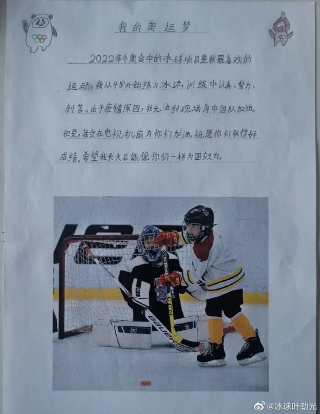 两天后,叶劲光还晒出了一位小冰球运动员的手写信,配文道:“我们一起加油!”
