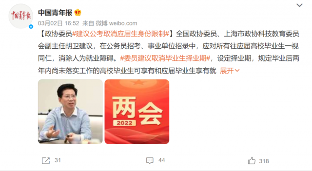 今年,全国政协委员、上海市政协科技教育委员会副主任胡卫提交了《关于取消应届生身份限制,保障平等就业权的提案》,建议逐步取消高校毕业生择业期政策,在公务员招考、事业单位招录中,应对所有往应届高校毕业生一视同仁,消除人为就业障碍。